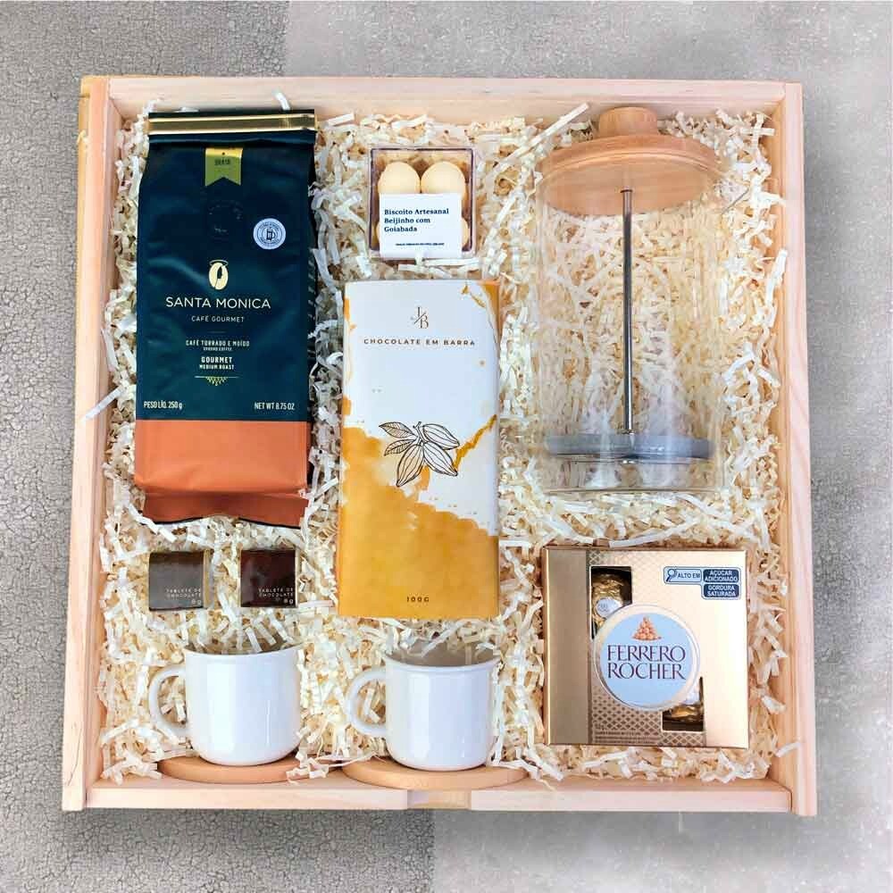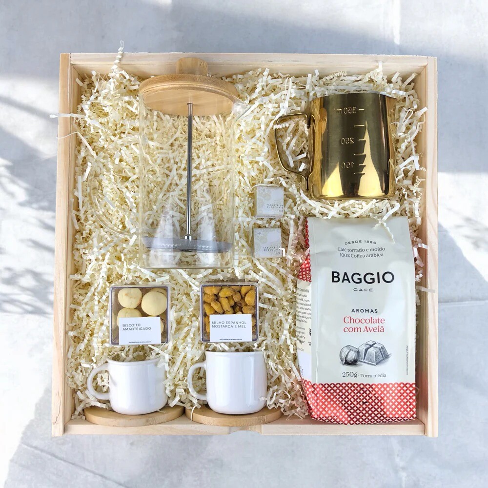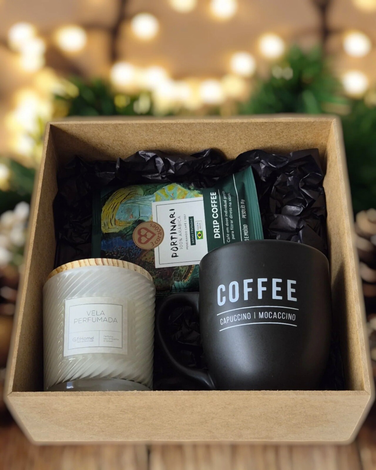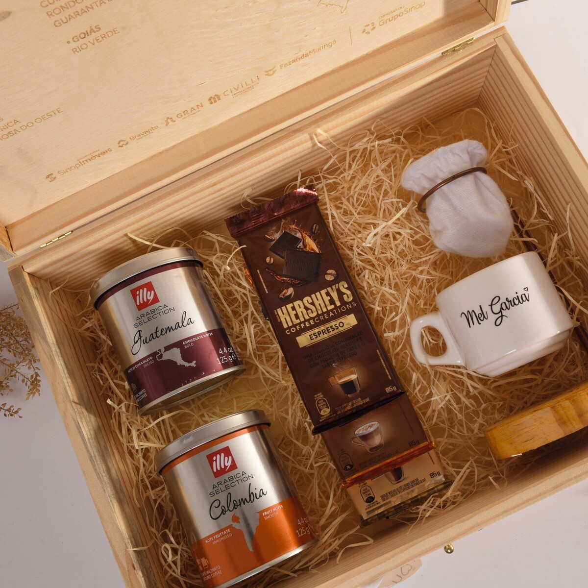 Inclui itens como xícaras, cafeteiras, canecas, colheres, bandejas, pacotes de café gourmet e acessórios de preparação. Todos os itens podem ser personalizados com o logotipo da empresa, cores corporativas e mensagens especiais.