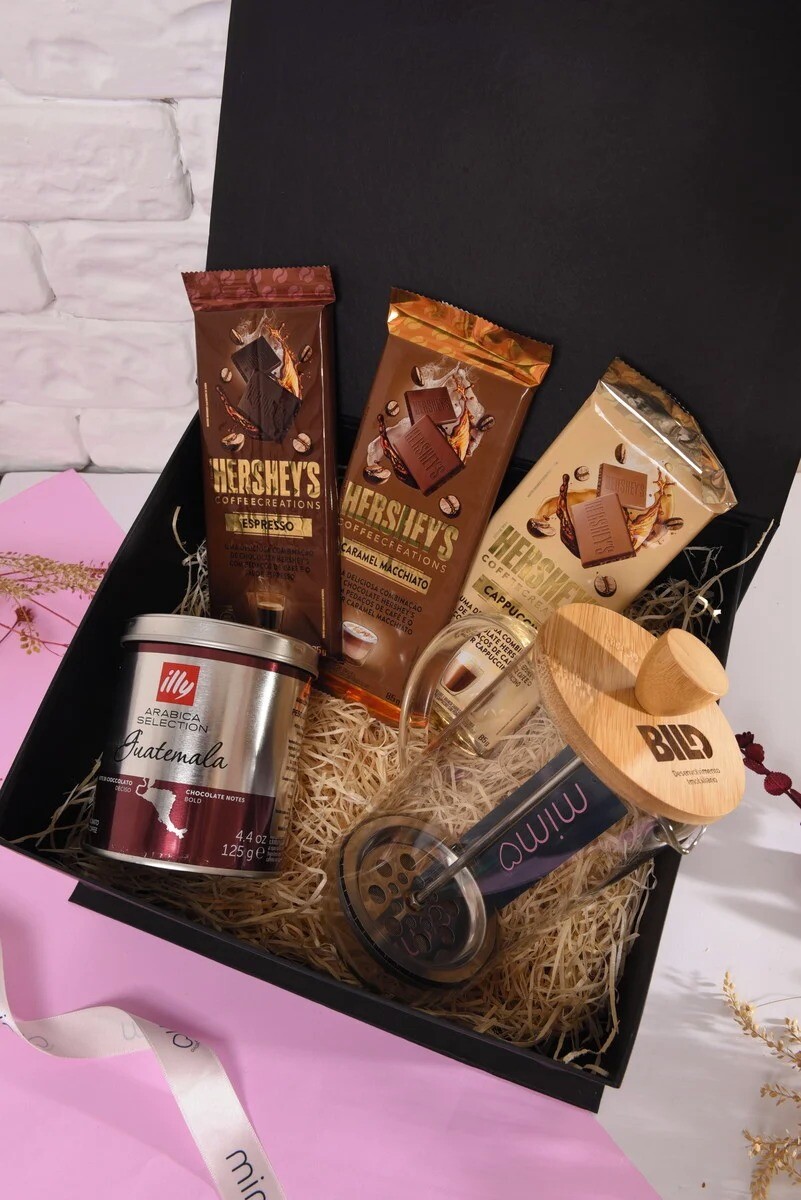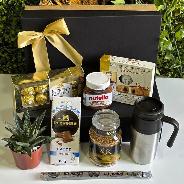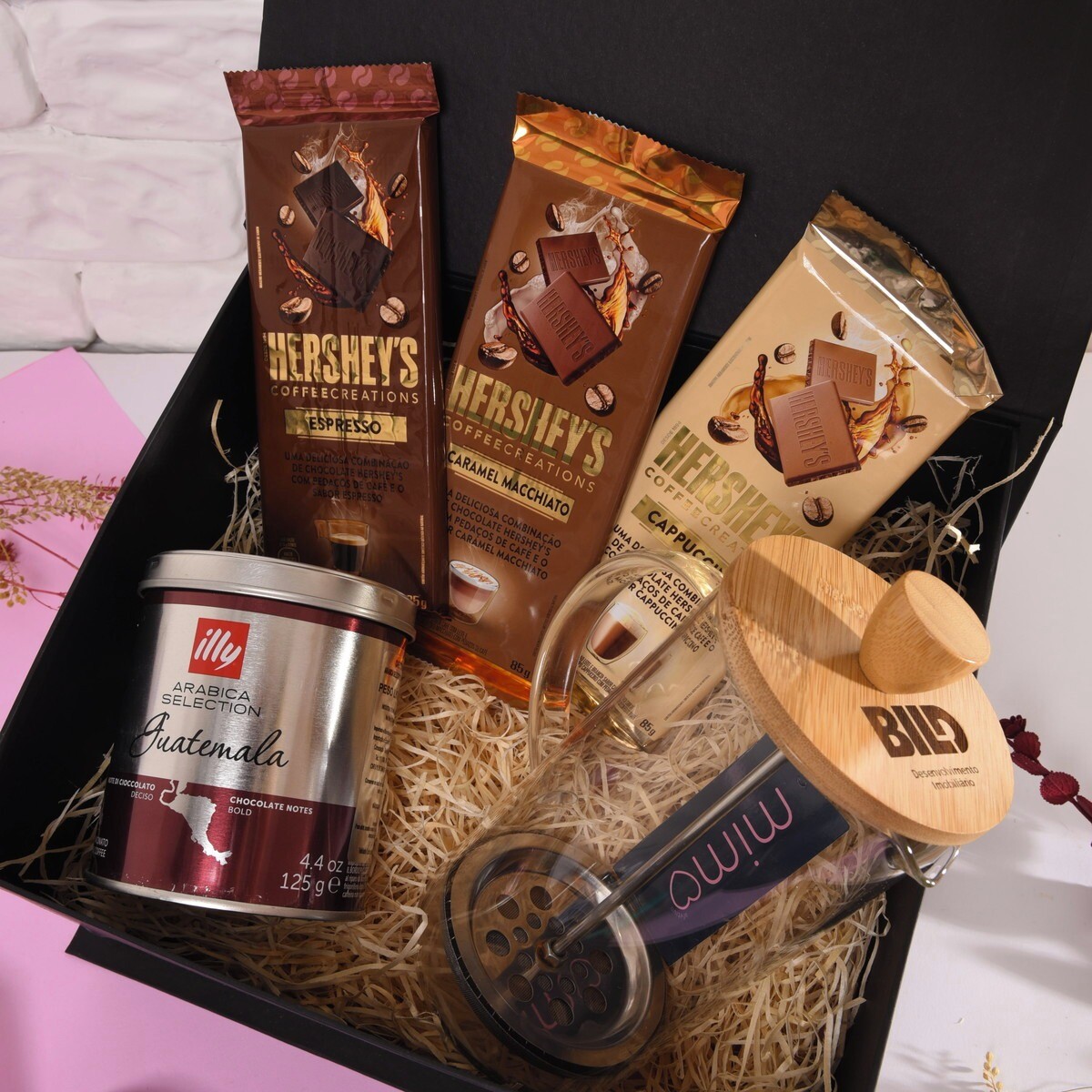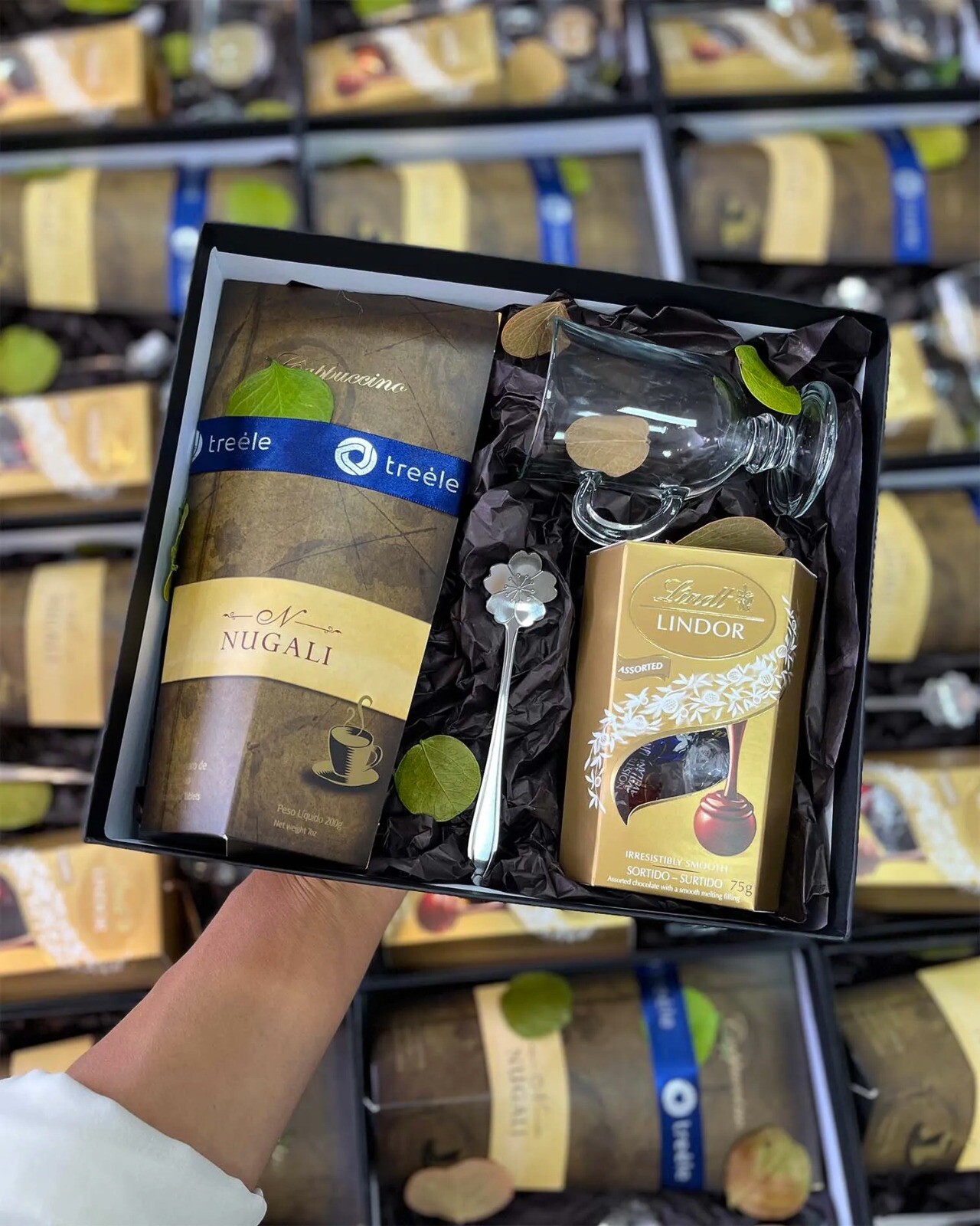 Inclui itens como xícaras, cafeteiras, canecas, colheres, bandejas, pacotes de café gourmet e acessórios de preparação. Todos os itens podem ser personalizados com o logotipo da empresa, cores corporativas e mensagens especiais.