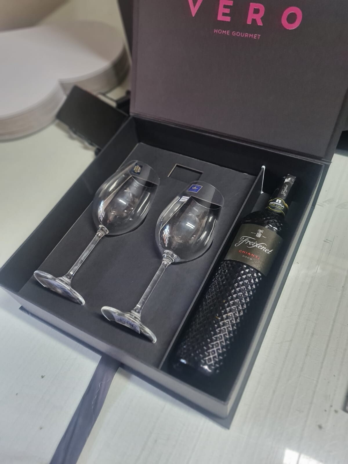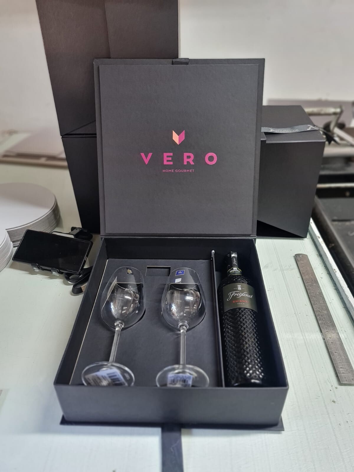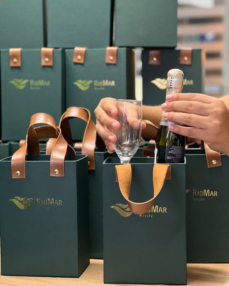 Caixa personalizadas para vinho e taças,