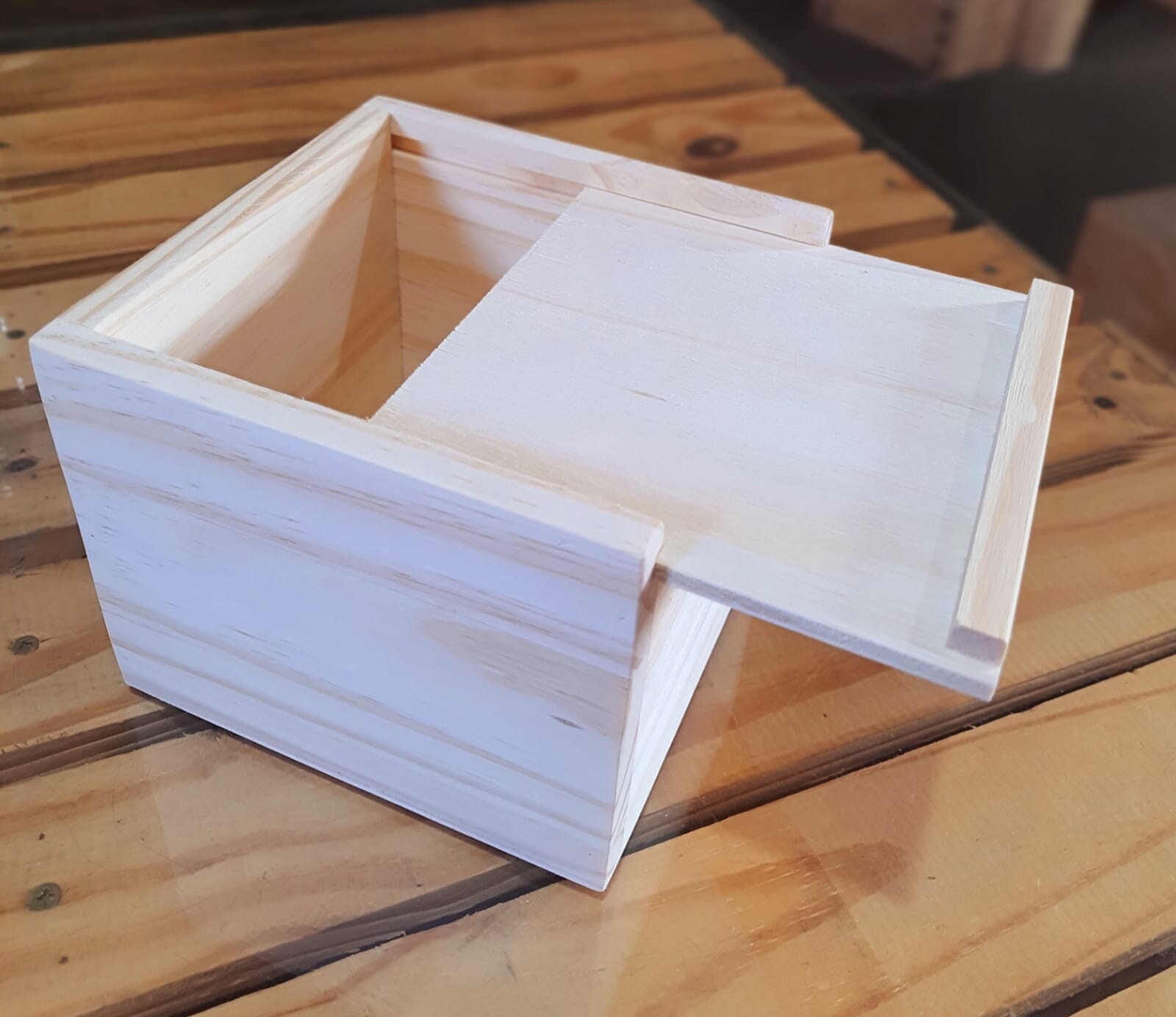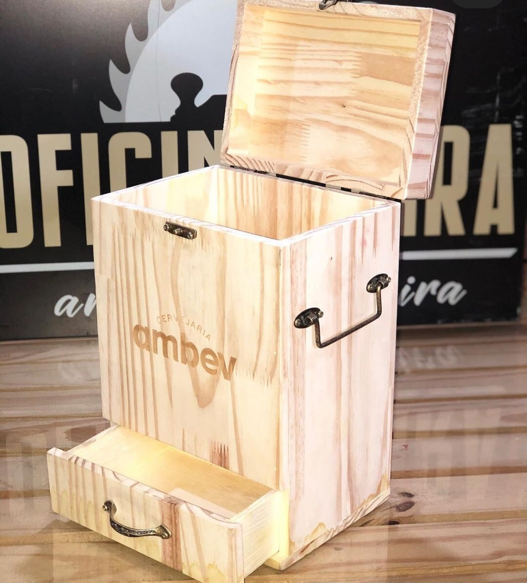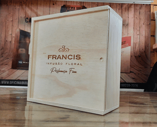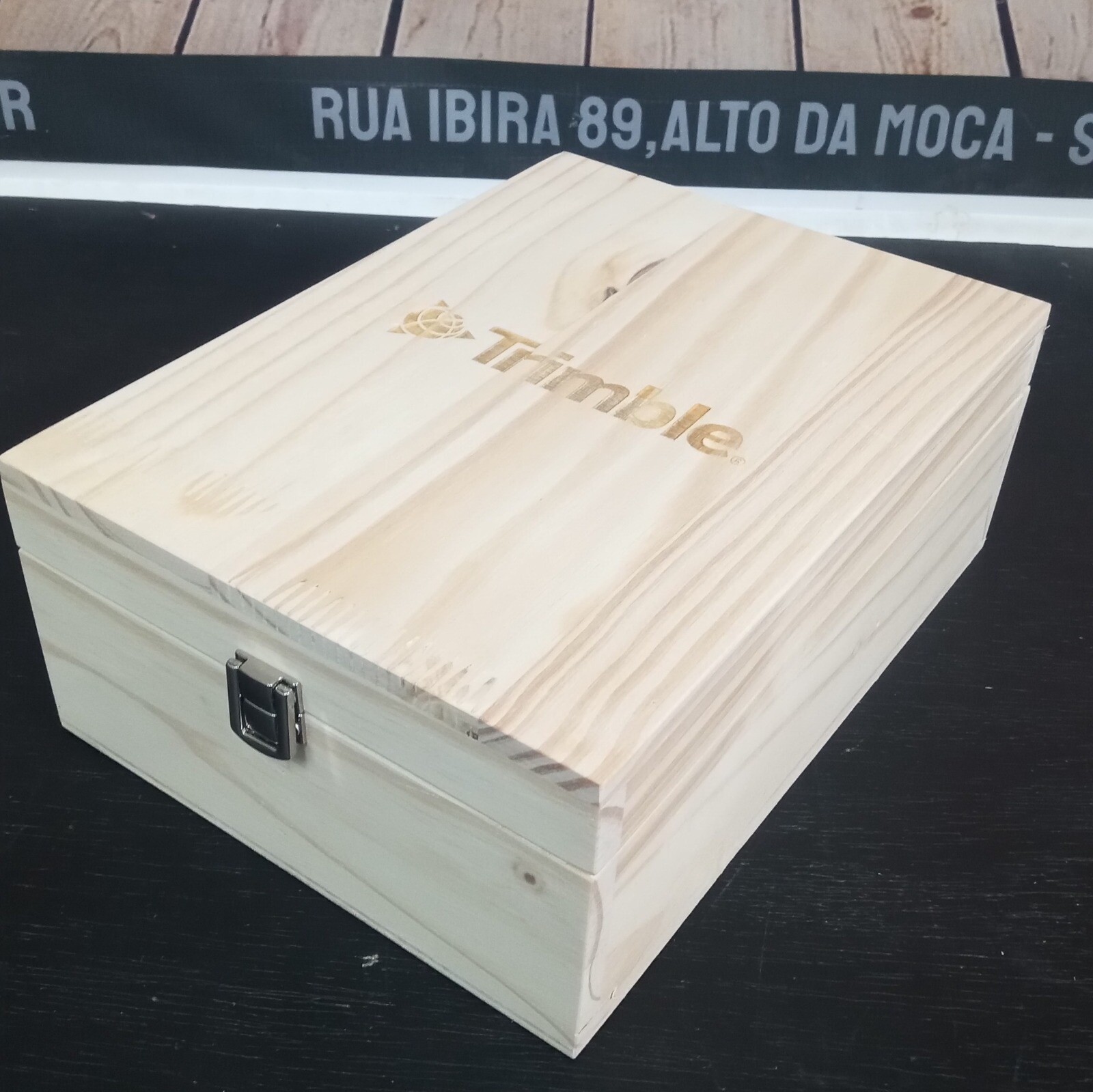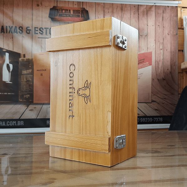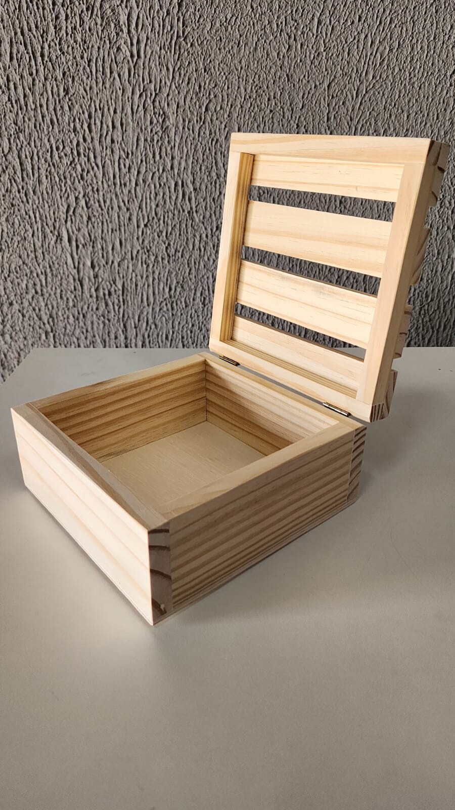 Caixa com acabamento natural, valorizando a beleza e textura da madeira Pinus e Paricá.