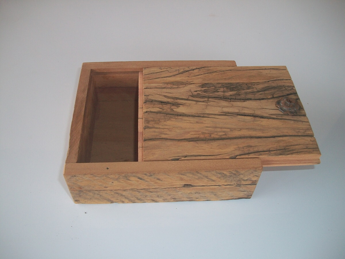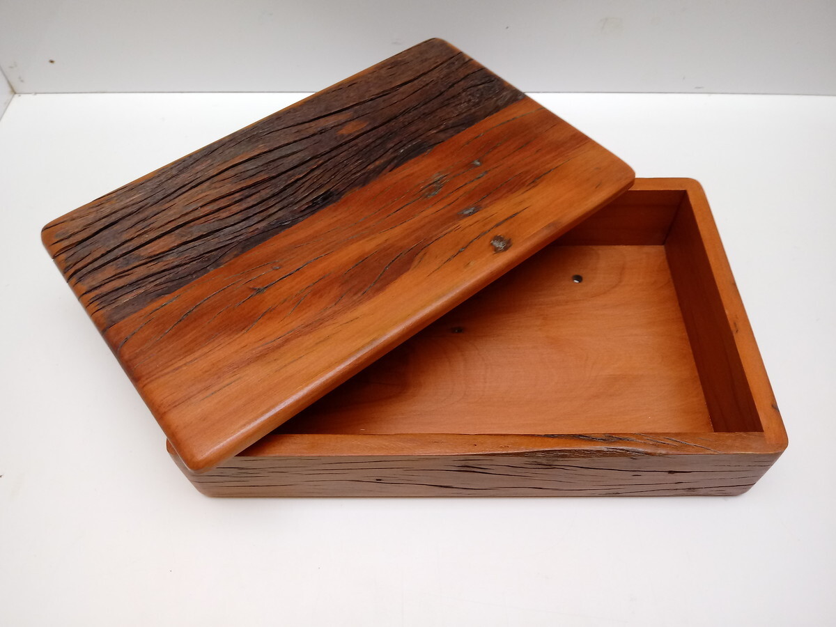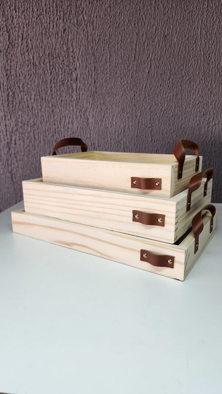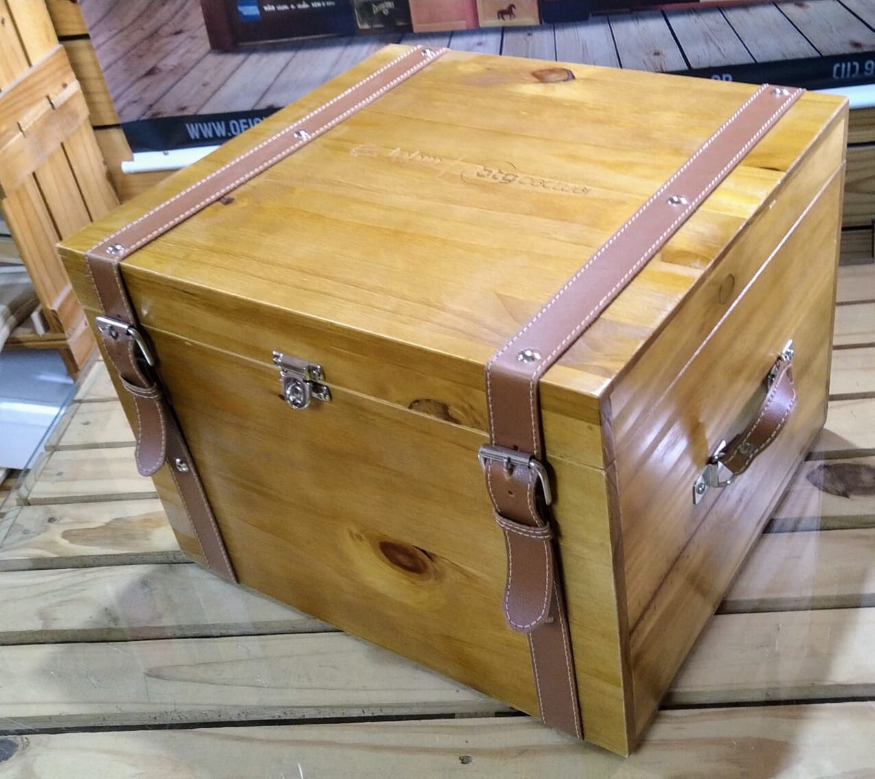 Caixa com acabamento natural, valorizando a beleza e textura da madeira Pinus e Paricá.