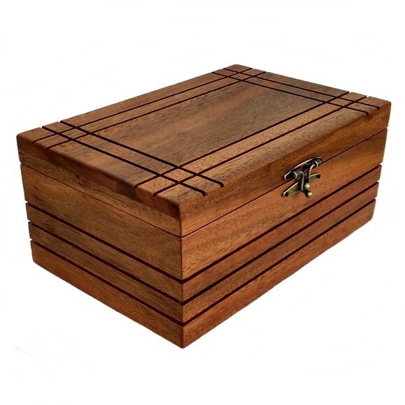 Caixa com tingimento mel, imbuia ou castanho, valorizando a textura e detalhes da madeira.